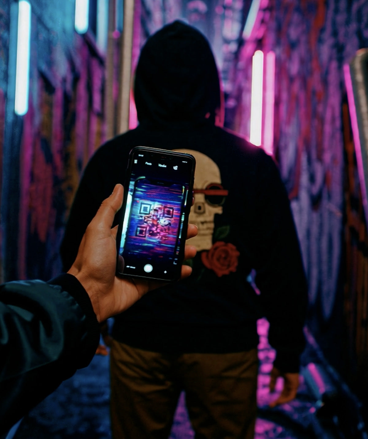 Built from heavyweight cotton with a clean streetwear silhouette, it carries a hidden QR code on the back. When scanned, it triggers a glitch screen, an interruption, a reminder that you’re not here to be filmed, posted, or turned into someone else’s story.